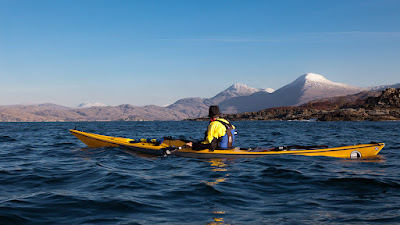 Once we left the land the SE wind increased to force 4, with whitecaps on the waves matching the snow caps on the mountains. I had to drop the sail as even without paddling I would have left Ian behind (and it was too cold not to paddle anyway). A swell from the SW was mixing entertainingly with the wind blown waves from the SE so there were no photos on the crossing but I can assure you that the bright sunlight, white caps with flying spray, dark blue sea and snow capped mountains are etched in our minds.